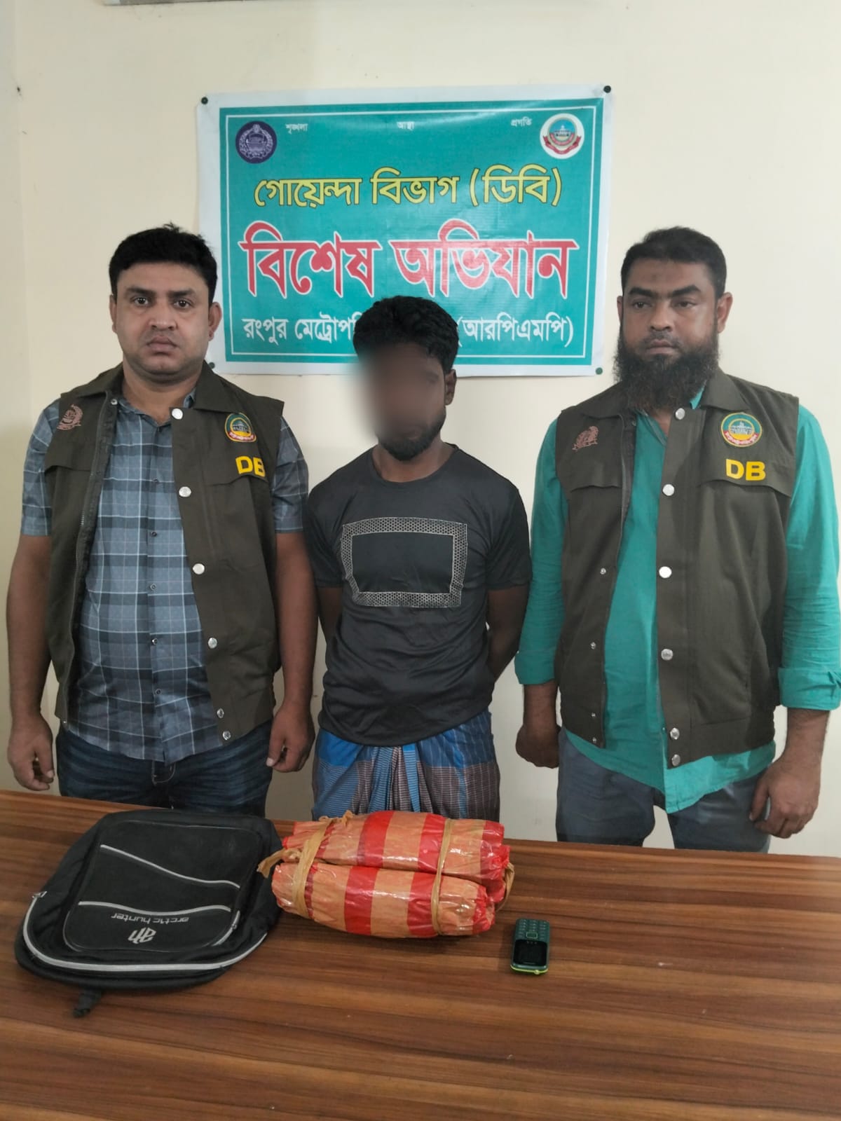রংপুর মেট্রোপলিটন পুলিশের গোয়েন্দা বিভাগ (ডিবি) এর অভিযানে এক কেজি ২০০ গ্রাম নেশাজাতীয় মাদকদ্রব্য গাঁজাসহ এক ব্যক্তিকে গ্রেফতার করা হয়েছে।