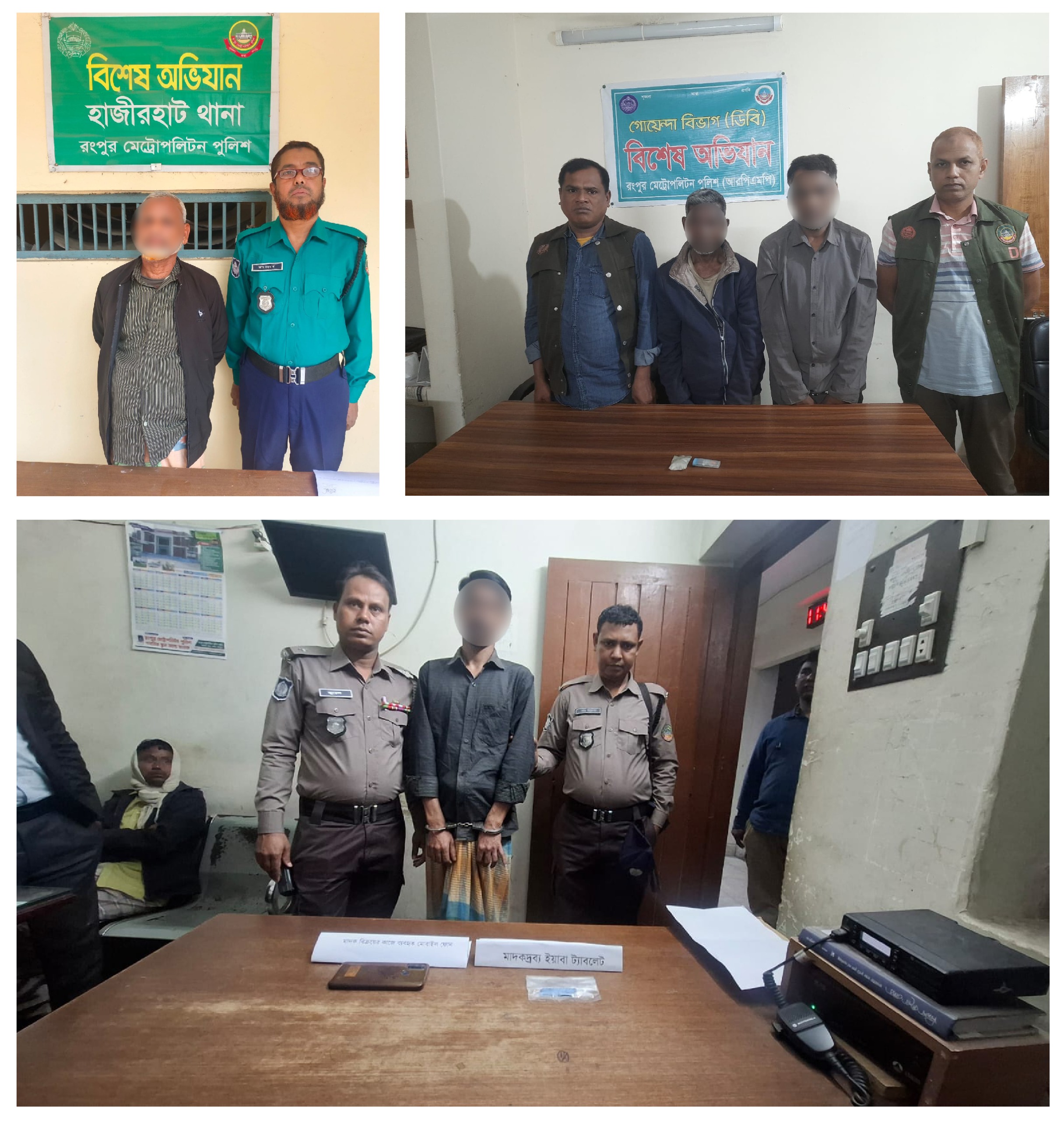 রংপুর মহানগর পুলিশের আওতাধীন পৃথক অভিযানে মাদকবিরোধী বিশেষ কার্যক্রমের অংশ হিসেবে ইয়াবা ও হেরোইনসহ মোট ০৩ (তিন) জন আসামীকে গ্রেফতার করা হয়েছে।
